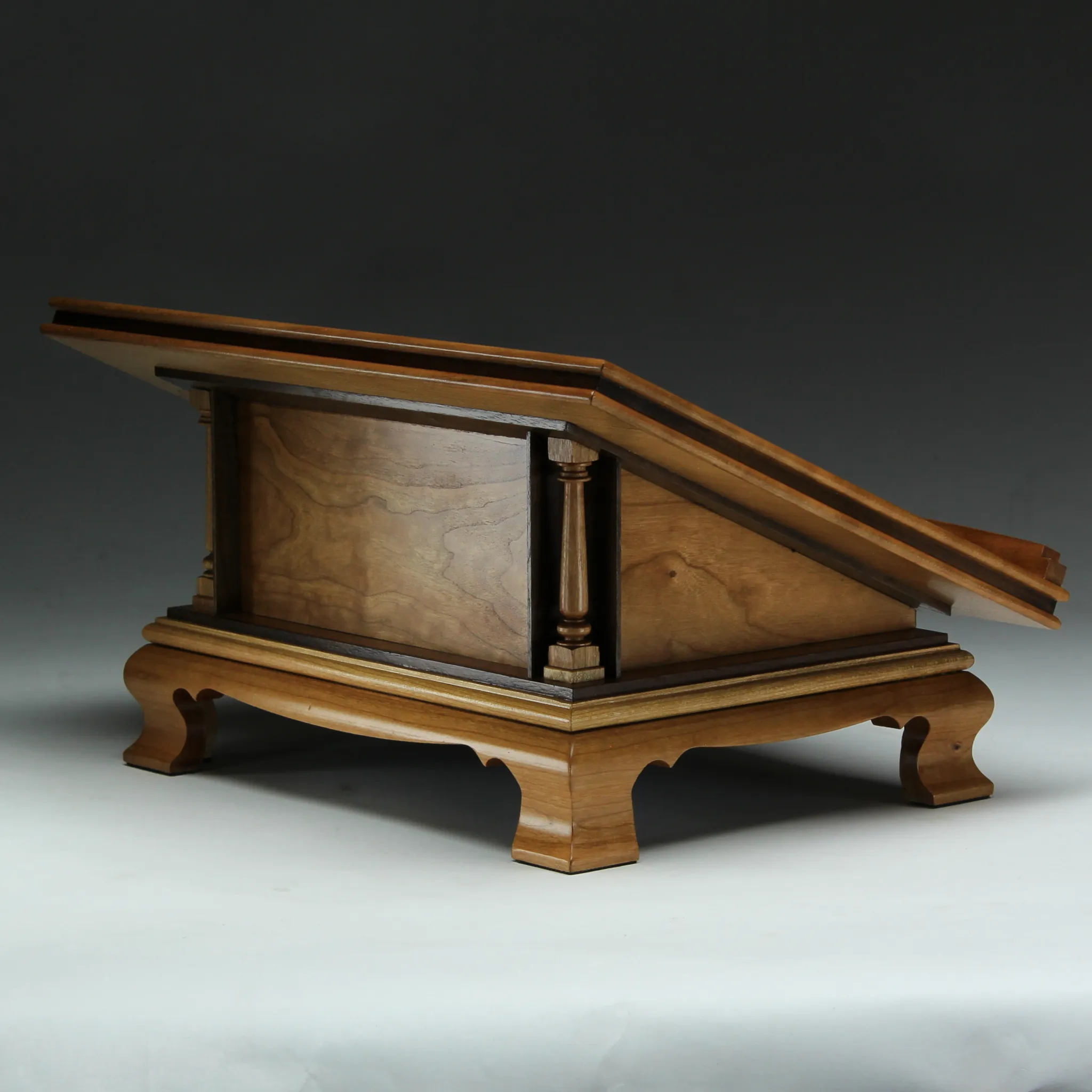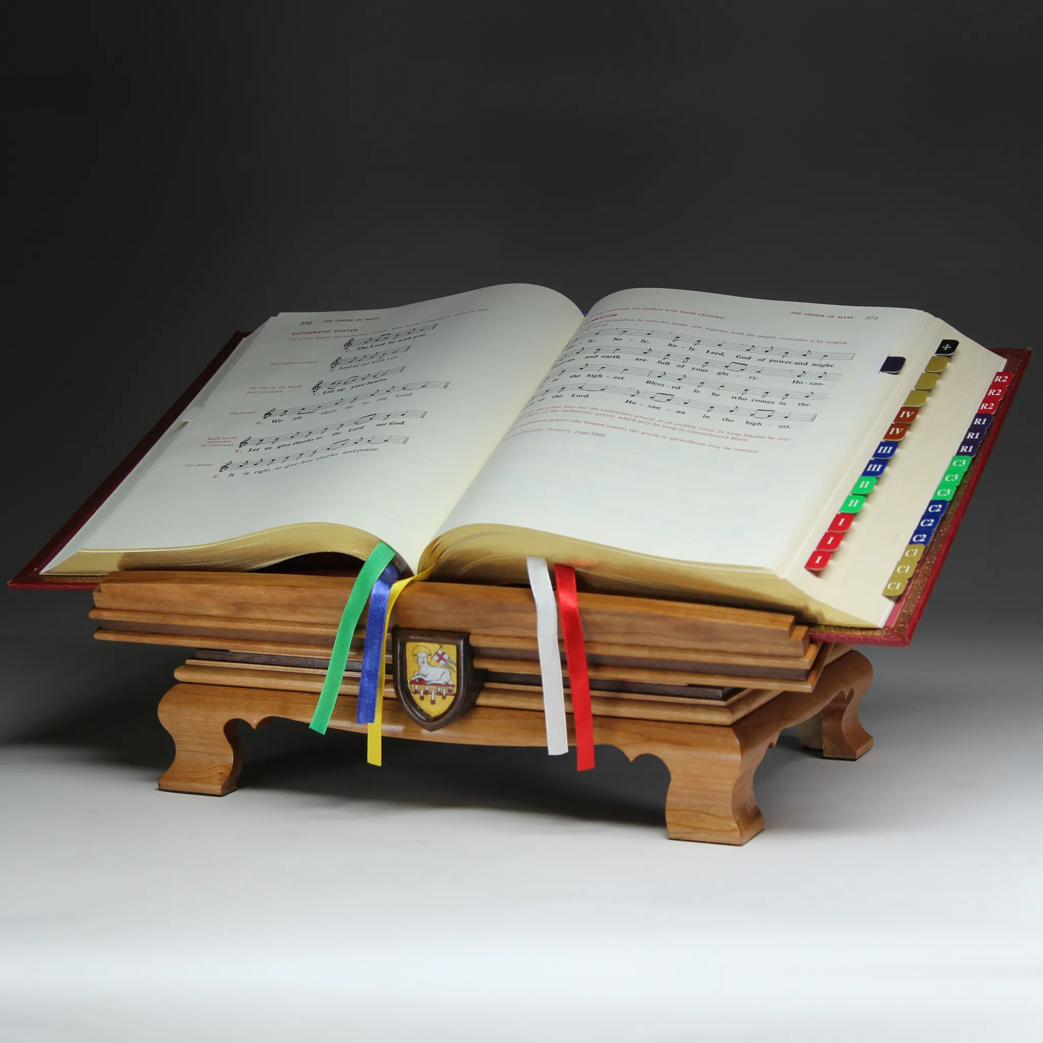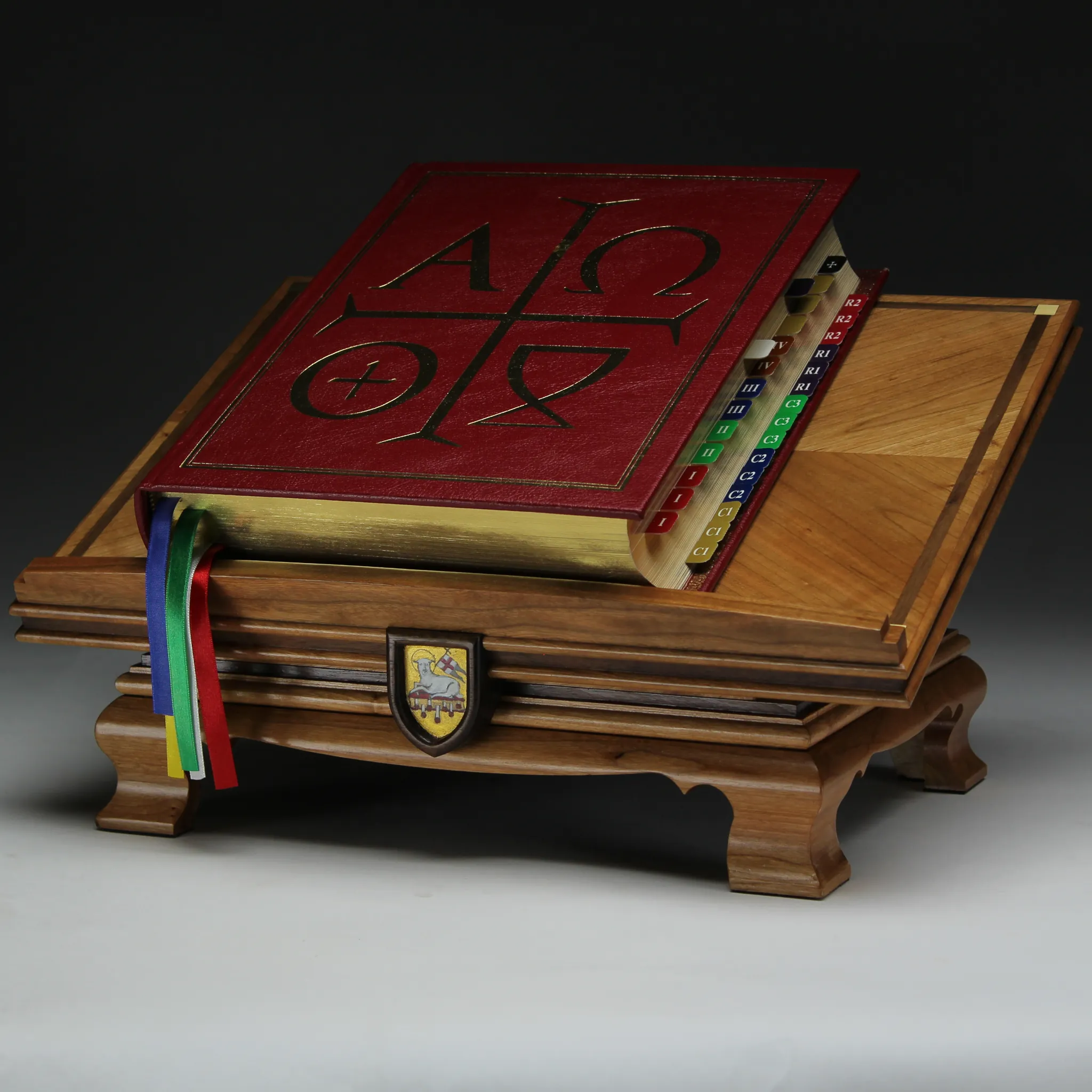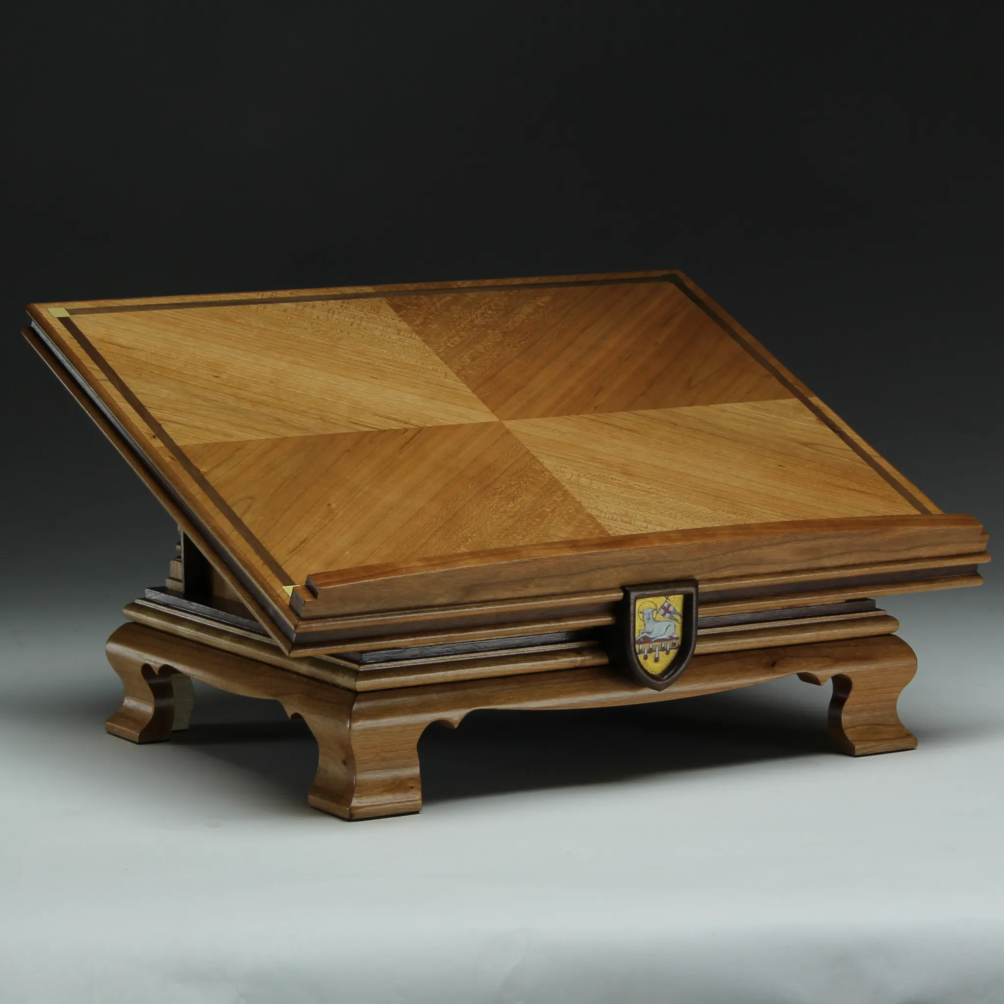 Wood Missal stand crafted from cherry and walnut with brass accents, hand-painted medallion and featuring a fixed angle top.
